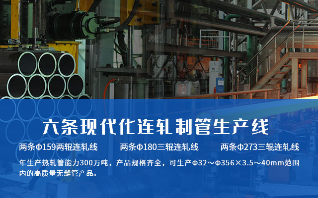 公司有Φ180三輥連軋線(xiàn)兩條,Φ273三輥連軋線(xiàn)兩條,產(chǎn)品規(guī)格齊全,可生產(chǎn)Φ32~Φ356×3.5~40mm范圍內(nèi)的高質(zhì)量無(wú)縫管產(chǎn)品。